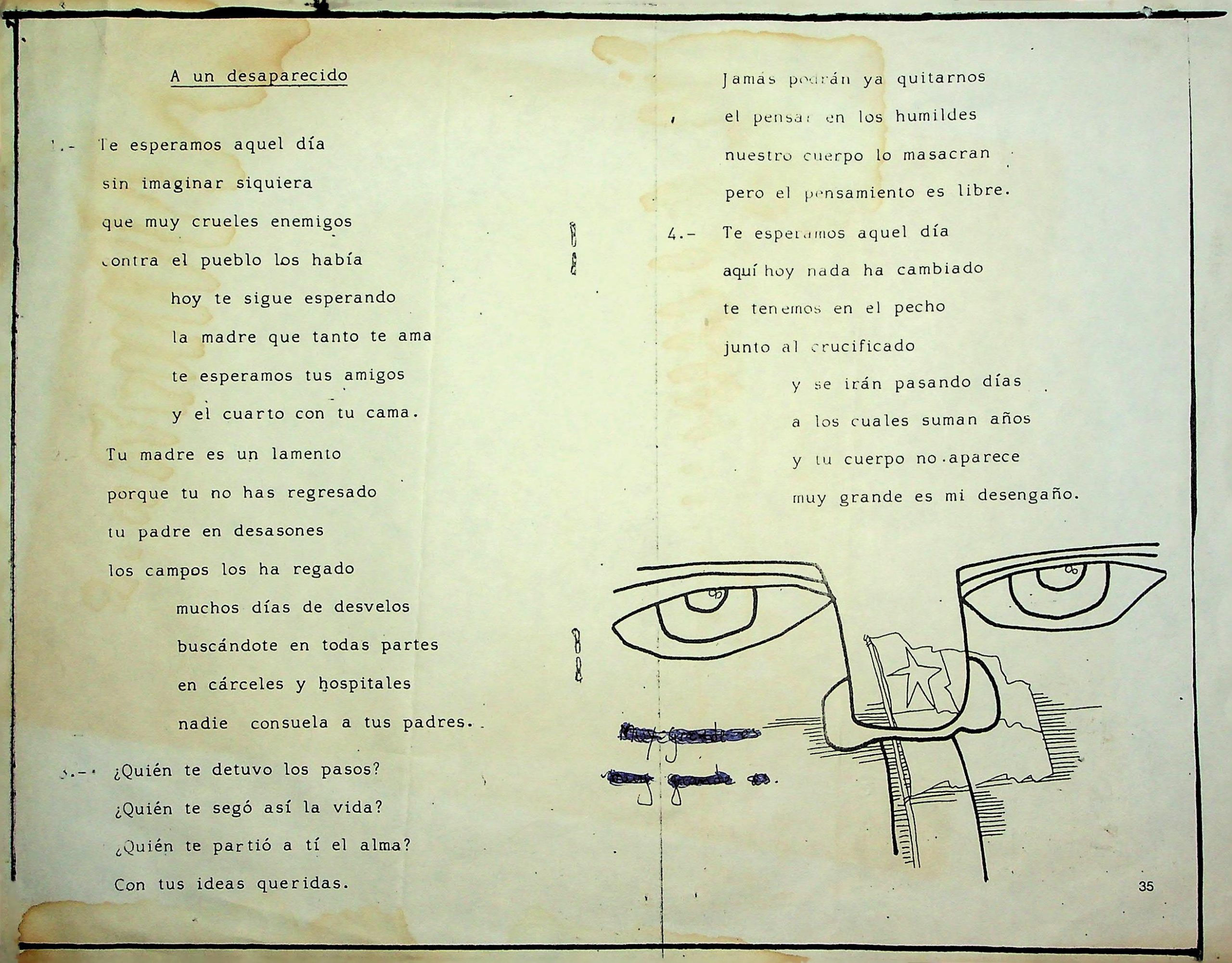 Poema testimonial manuscrito el cual relata como una madre espera a su hijo que no ha llegado aún, siendo una fuente primaria sobre las consecuencias de la represión política y la desaparición forzada. El poema, dividido en cuatro estrofas mantiene un tono de profunda tristeza y desengaño.